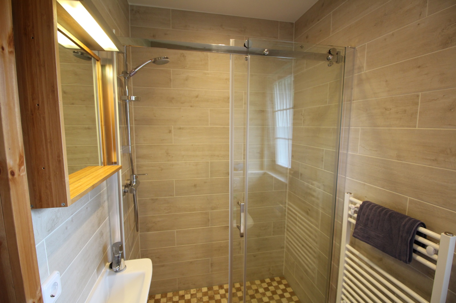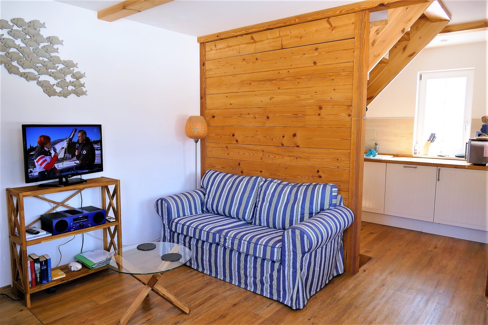 On the ground floor you will find the living room with an open fitted kitchen and a fireplace; also the terrace. In the kitchen you will find a refrigerator, dishwasher, microwave and induction hob. For your entertainment you will find a flat-screen HD-TV. Furthermore there is a bathroom with shower and towel radiators.