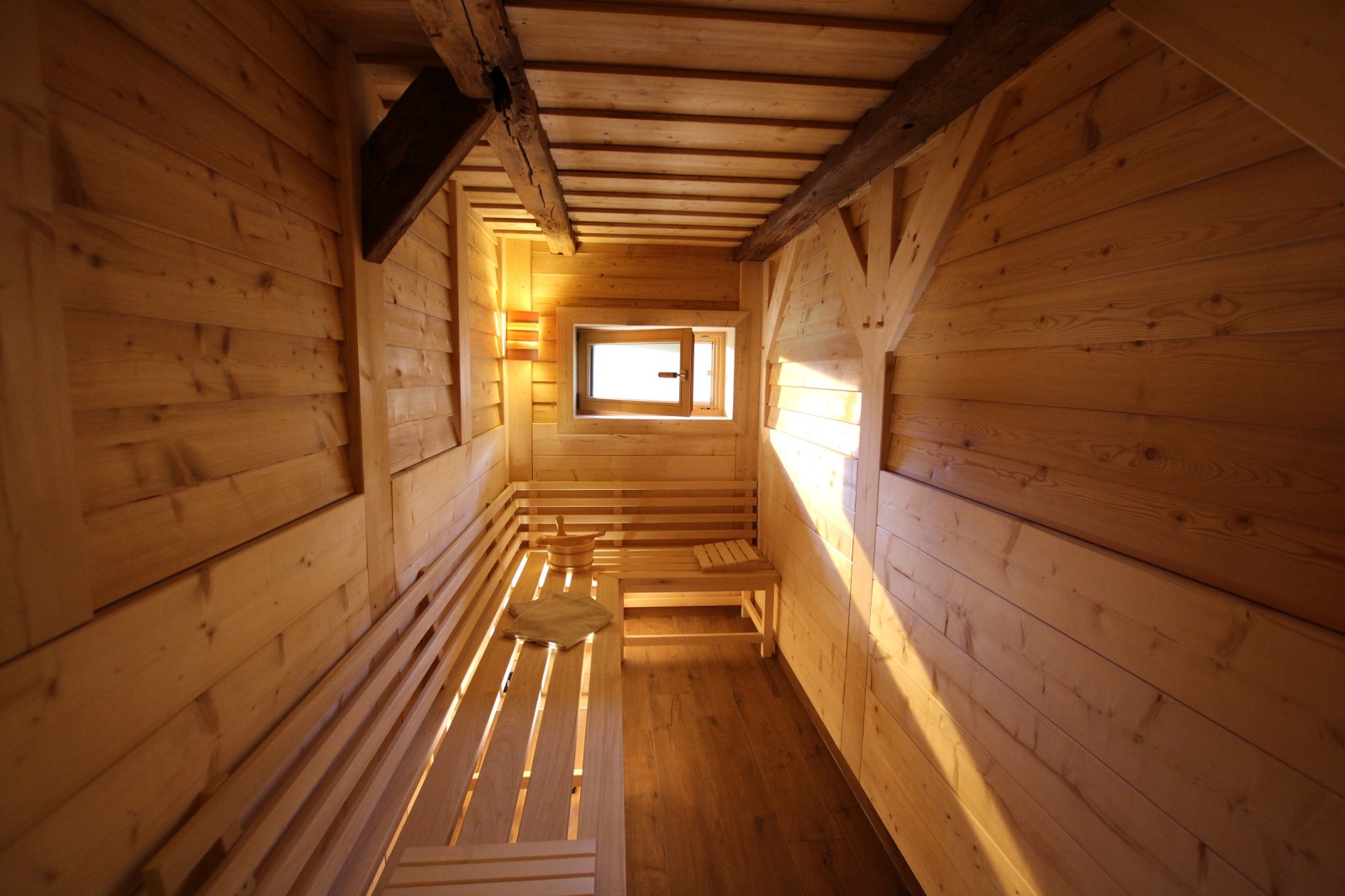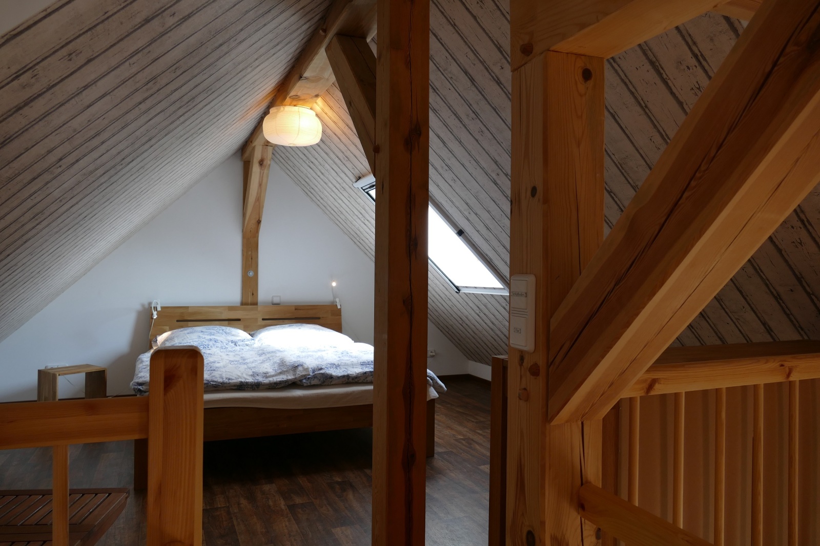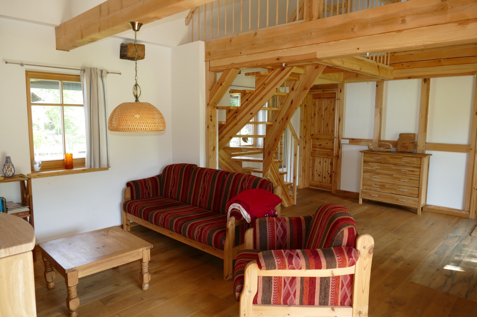 Die Scheune verfügt über einen großzügigen Wohnbereich, Küche, Bad, ein kleines Schlafzimmer sowie einen offenen Schlafboden im Dachgeschoss. Zur Ausstattung gehören Kaminofen, Sauna, Fußbodenheizung, OLED-TV, WLAN (eingeschränkt möglich), sowie eine voll ausgestattete Küche.